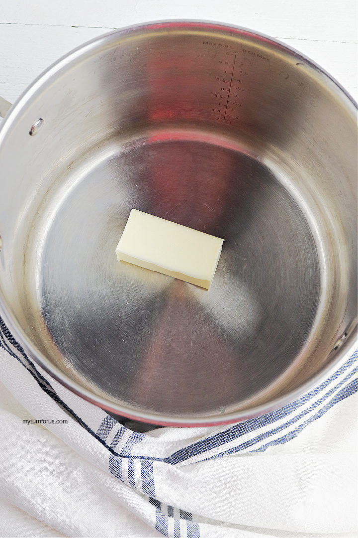 - Add ¼ cup (½ stick or 4 tablespoons) of butter in a large saucepan. Place over medium heat and cook until butter is melted.