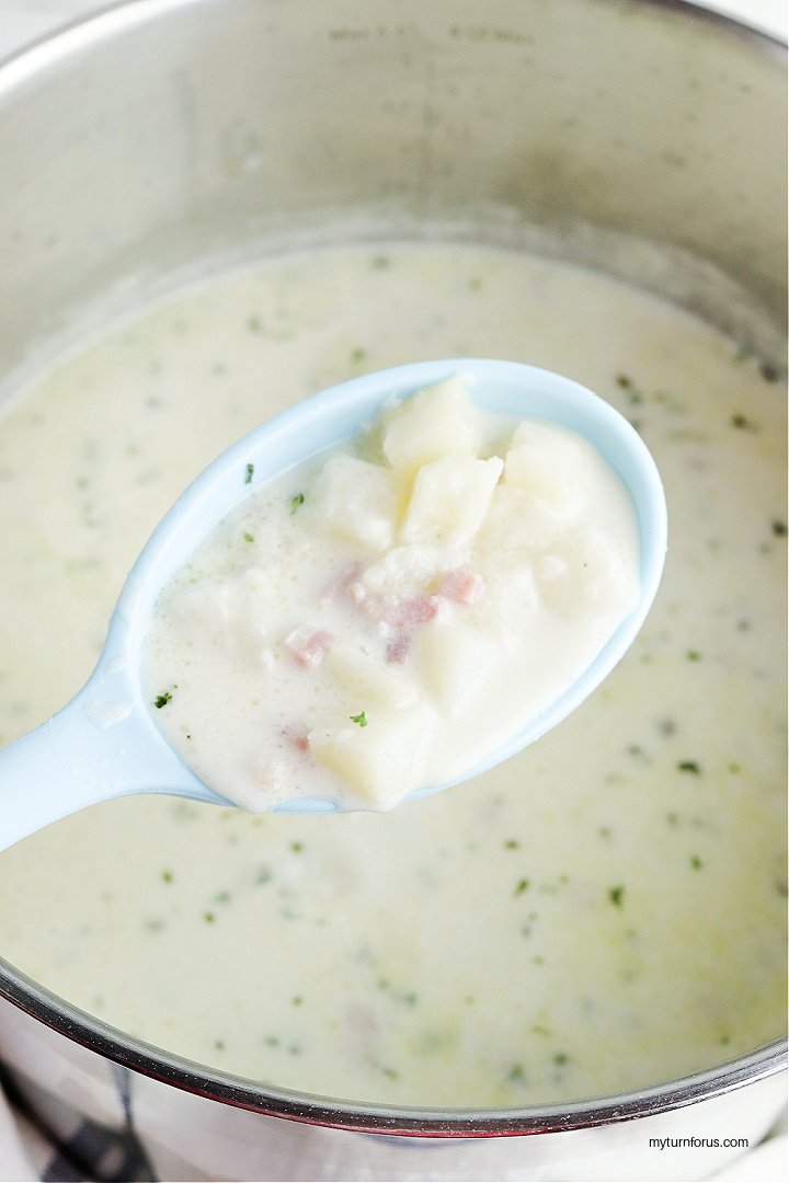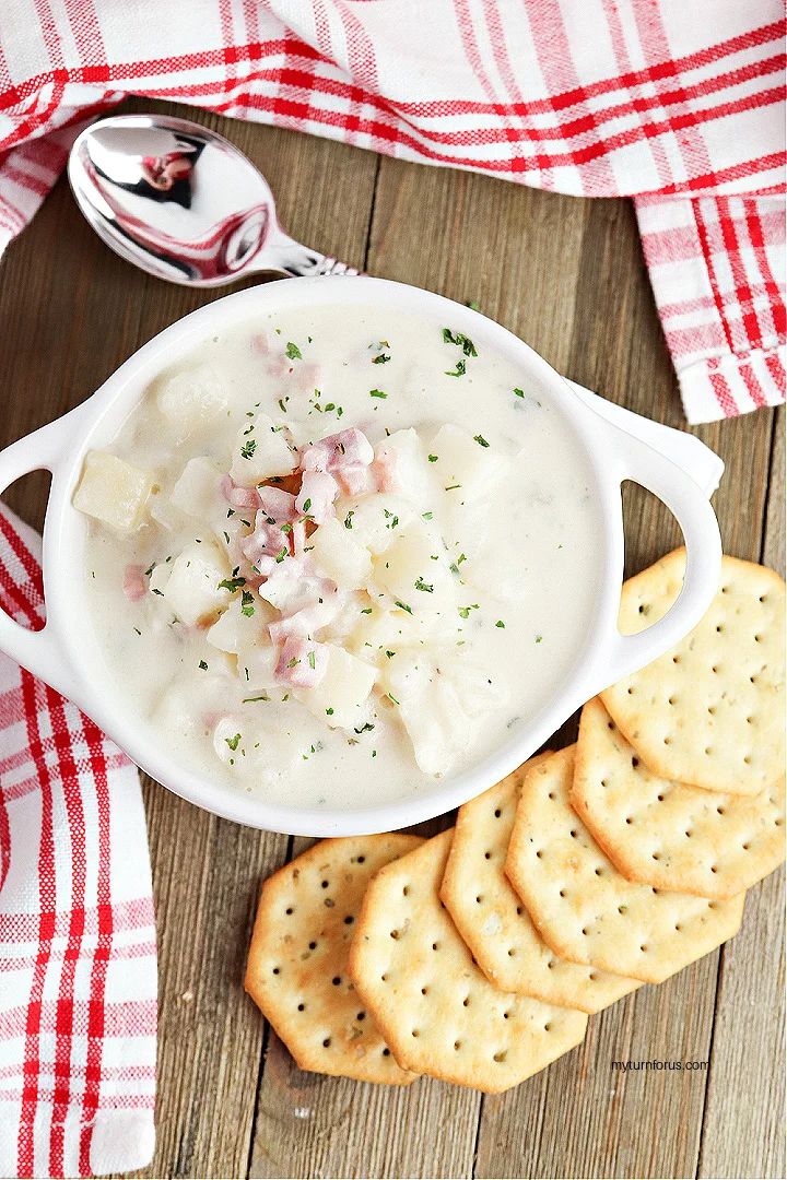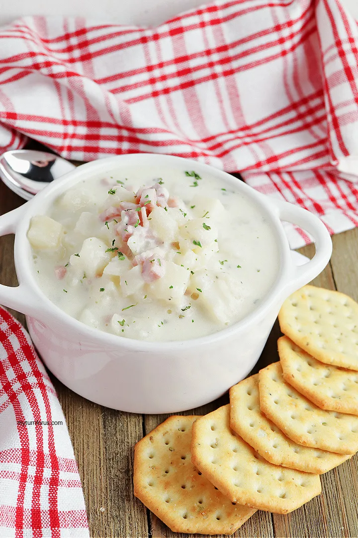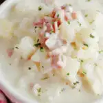This is one of the easiest ham and potato soup recipes. No cutting and dicing potatoes since we use frozen diced hashbrowns. Otherwise we use all fresh ingredients such as heavy cream, butter and chicken broth in this ham and potato soup.