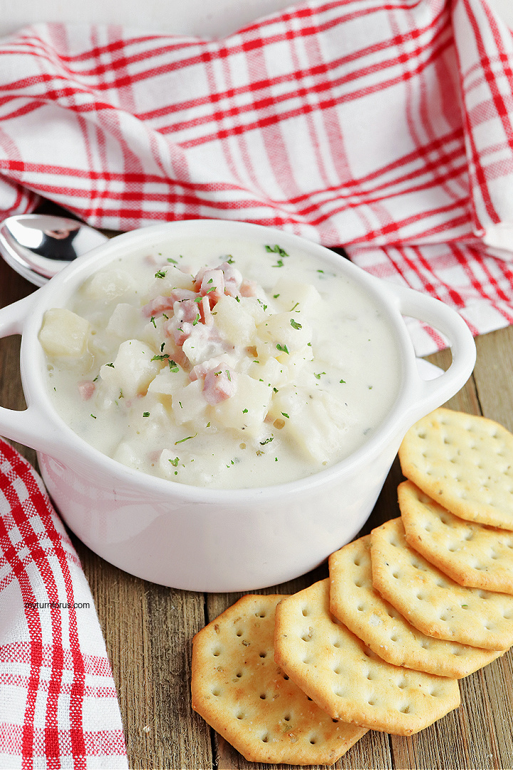 This homemade ham and hashbrown soup recipe is rich in flavor but only takes about 10 minutes actual hands on time. It’s a great way to use leftover ham.