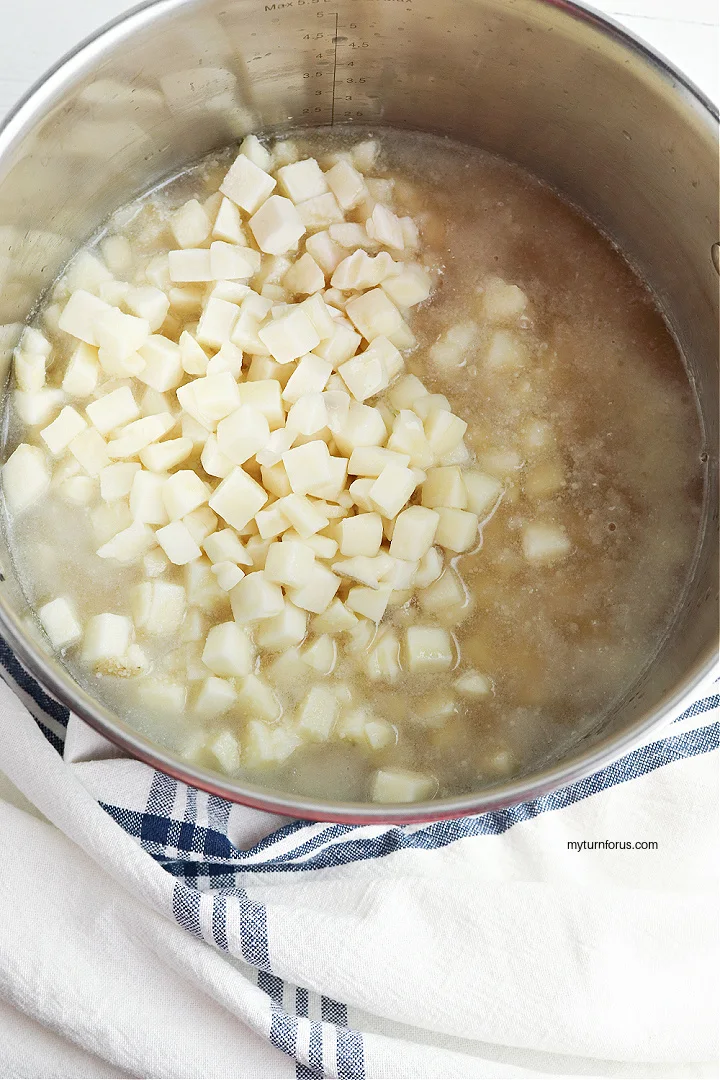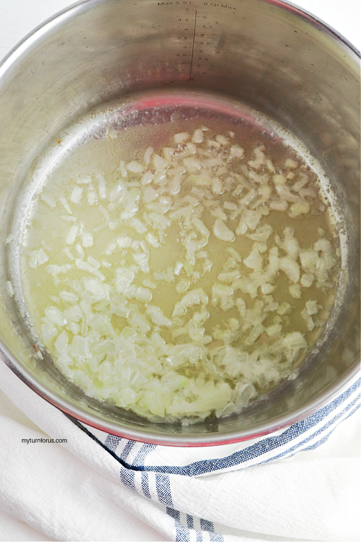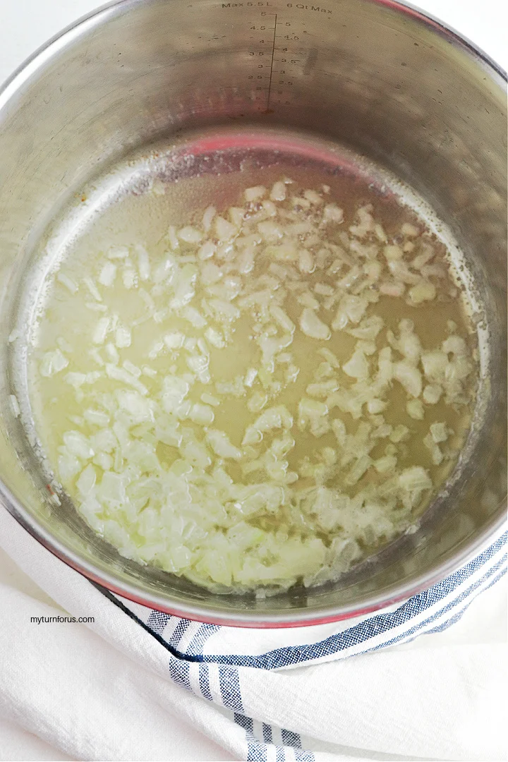 - When the butter is melted, add the chopped onions and sauté until tender and translucent, about five minutes.