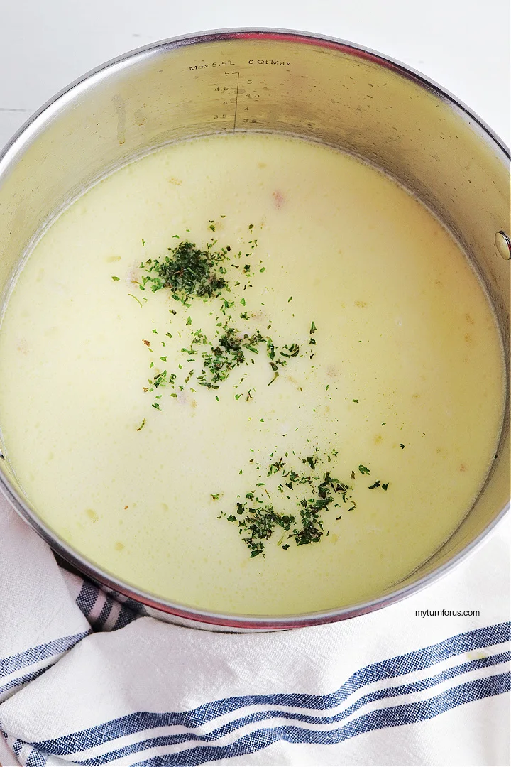 - Add the heavy cream, and the cornstarch mixed with water and the parsley. Stir to combine all ingredients.