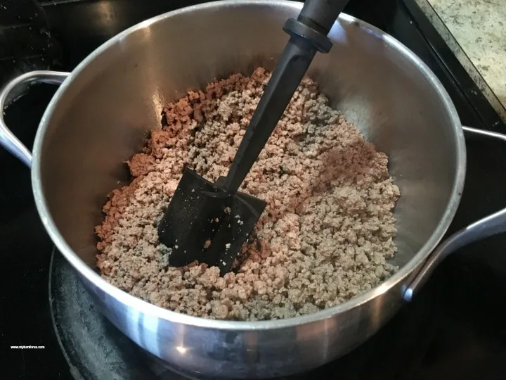 - You might wish to use this handy Mix N’ Chop to break the meat down as it’s cooking, it makes it so much easier. We love ours.