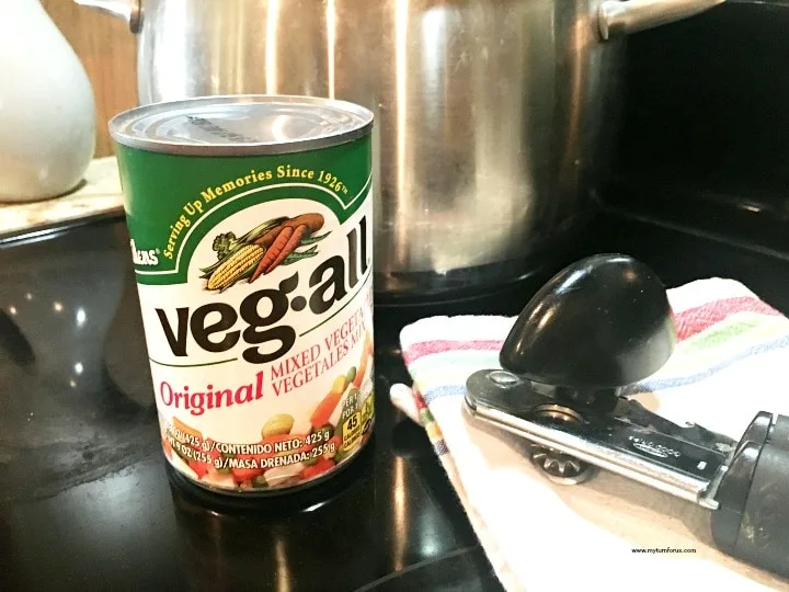 - Add two cans of Veg-All Mixed Vegetables® (see below) and cook for an additional 15 minutes. Or any mixed vegetable blend would work.