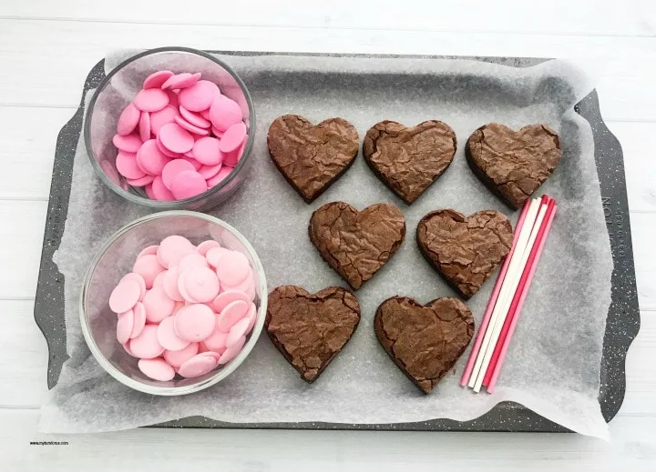 Mix the brownies according to the package directions but bake in a 13 X 9 pan. After allowing the brownies to cool completely, cut heart shaped brownie pops using this Valentine cutter. Then line a baking sheet with parchment paper. Pour 5 oz of light pink candy and 5 oz of darker pink ones into two microwave-safe bowls.