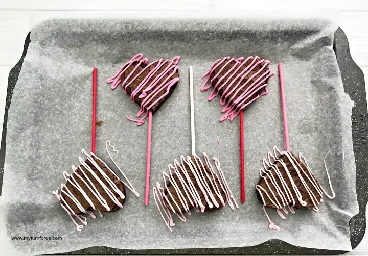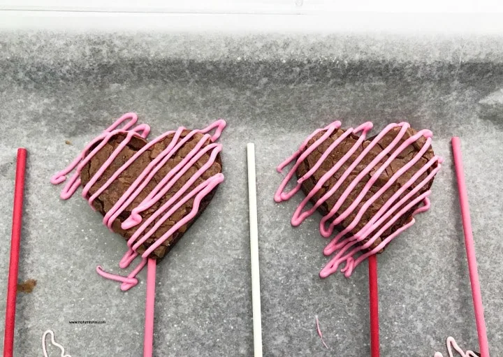 Snip a small corner of the baggie and gently squeeze the melted candy onto each Valentine brownie pop in a zigzag pattern. Allow them to cool completely.