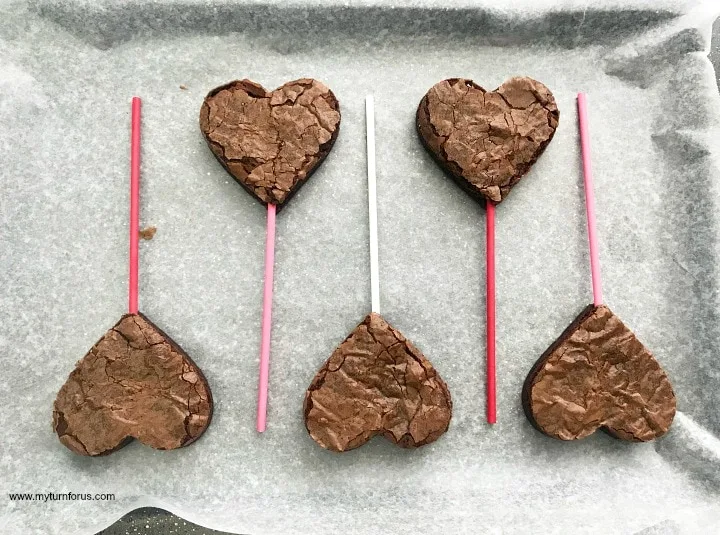 - Gently insert a lollipop stick into the base of each brownie and place on the baking sheet.