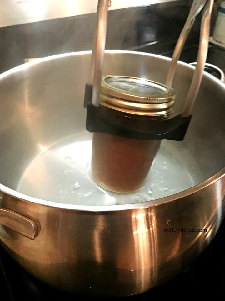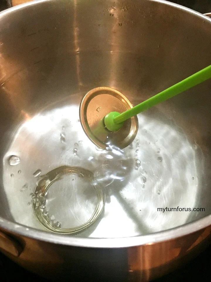 Fill a home canner  half-way with water.  You could also use a large sauce pot or stockpot with a cake rack placed on the bottom to keep the jars from touching the bottom of the pot.  Place 4 half-pint empty jars, lids, and rings in the water, bring water to a simmer over medium heat.   Remove the jars with a jar lifter one at a time and fill.     Use this green handy little magnet Lid Lifter to remove the lids and rings and it is a must-have in our house.  It grabs the metal lids and rings to make it so much easier when we are canning apple butter or anything else.
