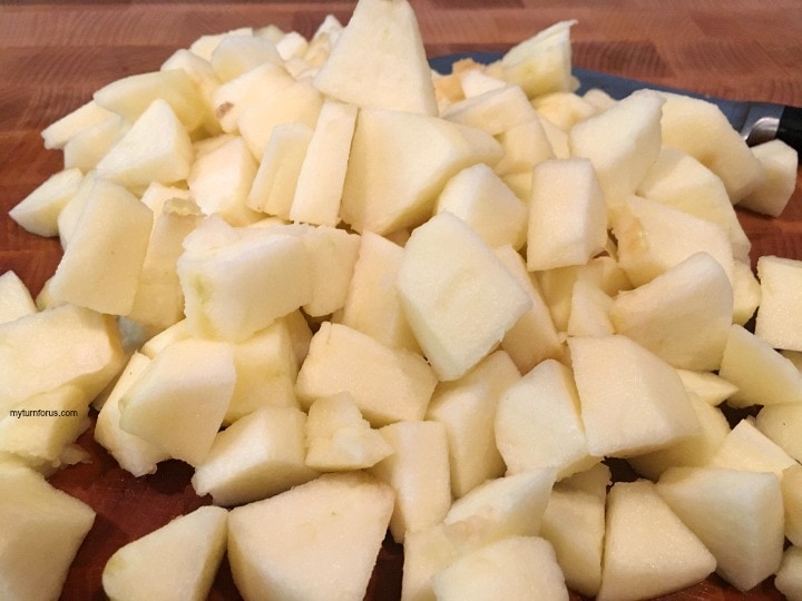 Start your slow cooker apple sauce by peeling, coring and chopping the apples into bite-size pieces.  There is no need to treat the apples so they will not brown.  We will be putting them into the crockpot immediately.