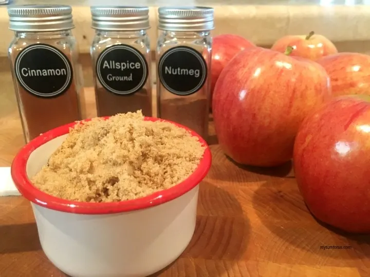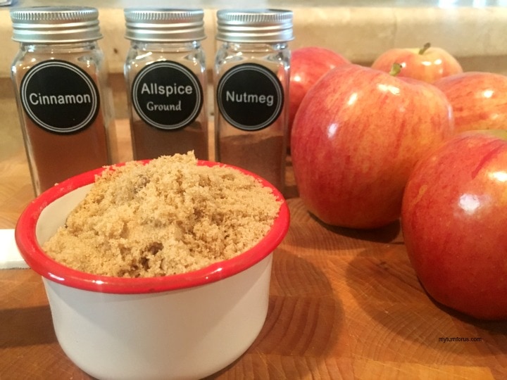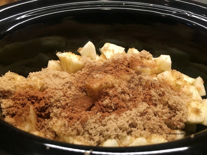 Place the chopped apples in a slow cooker, add the brown sugar, cinnamon, allspice, and nutmeg.