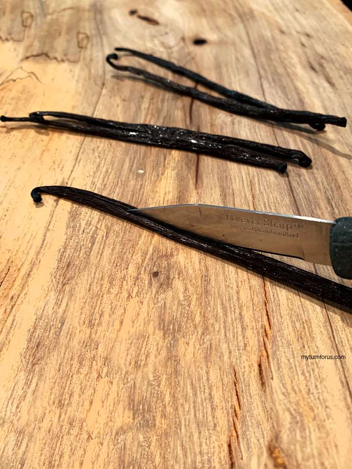 Then I read the ingredients on my Pure Vanilla Extract in my pantry and noticed the ingredients were vanilla, water and 35% alcohol. That still doesn’t sound very pure to me, it sounds a little watered down. Right? So we have been making our own at home which we know is Pure Vanilla!