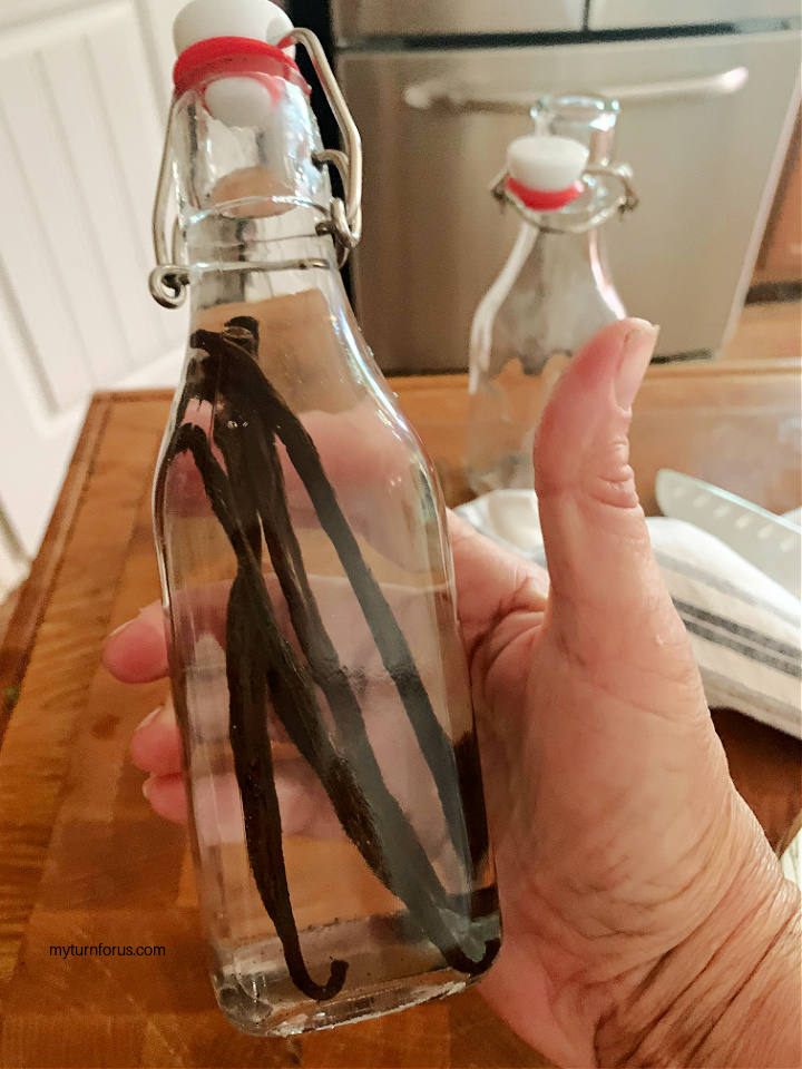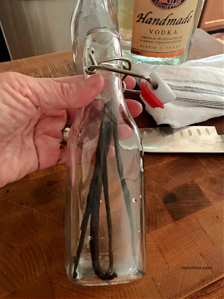 Do you remember when we noticed that most of the vanilla extract on the store shelves was imitation? And the Pure Vanilla was so much more expensive? Before we started to make our homemade vanilla extract, we did a little research. I actually googled imitation vanilla and “vanilla flavoring”. Yep, it wasn’t pretty. Imitation vanilla sometimes comes from pine bark, fermented bran, sugar, and a little vanilla flavoring. Apparently to buy real vanilla extract, one needs to look for the word “Pure”, as in Pure Vanilla Extract.