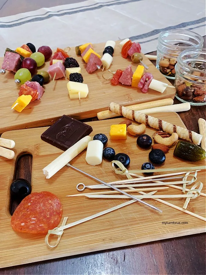 - Gather together meats and cheeses or other jarcuterie ingredients of your choosing. And grab several small skewers or food picks.