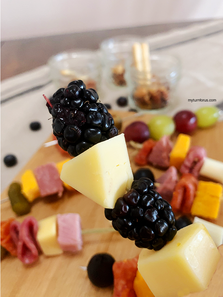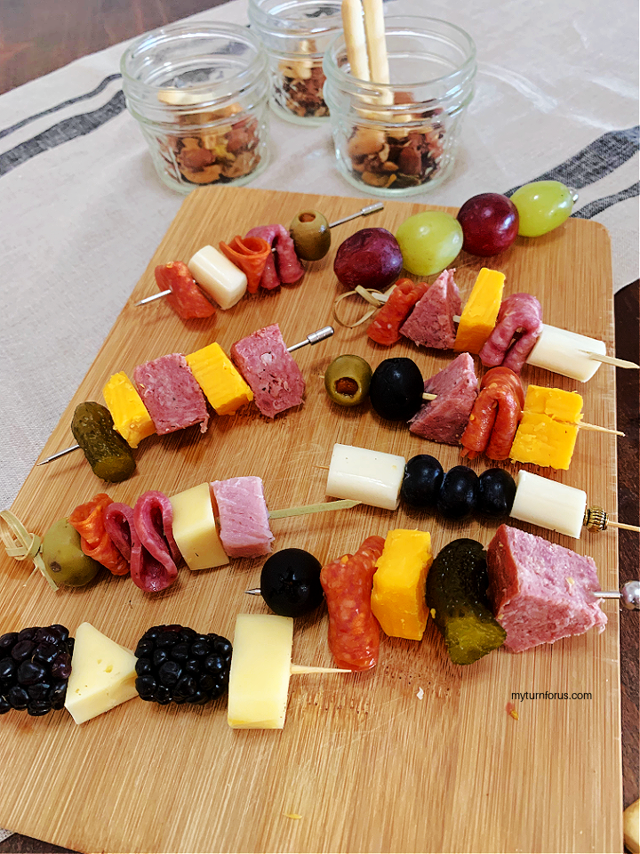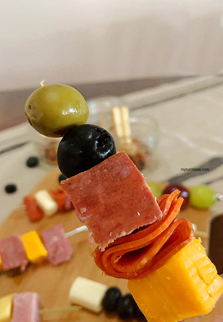 - Continue to make several jarcuterie skewers using different combinations. You will need at about 3 skewers for every individual charcuterie cup.
