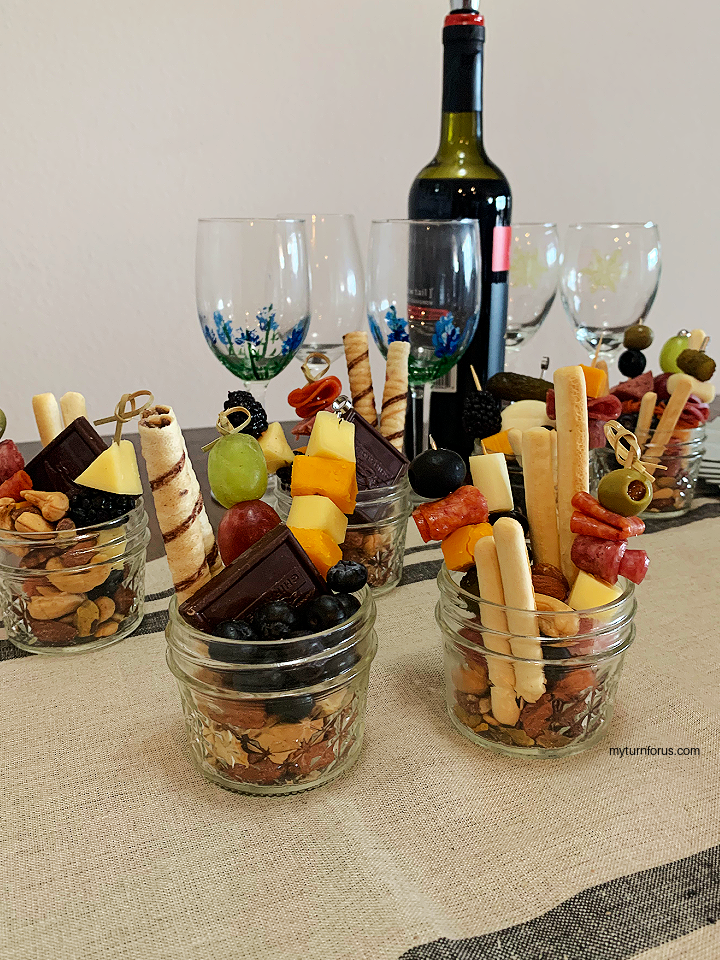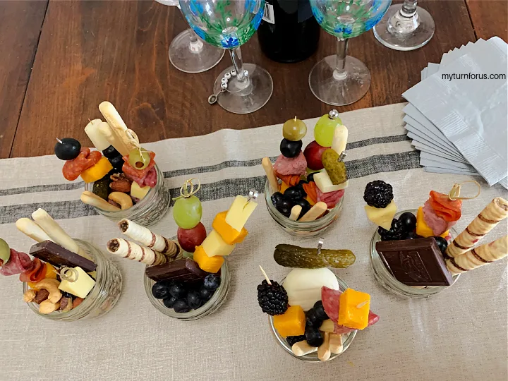 Even though we use the small (4 ounce) mason jars for these appetizers, they are loaded with goodies. And they are the perfect accompaniment to any cocktail or wine party. These jarcuteries are like little personal charcuterie boards. So very cute! Trust me you and your friends and family will love them. And they are not hard or expensive to assemble.
