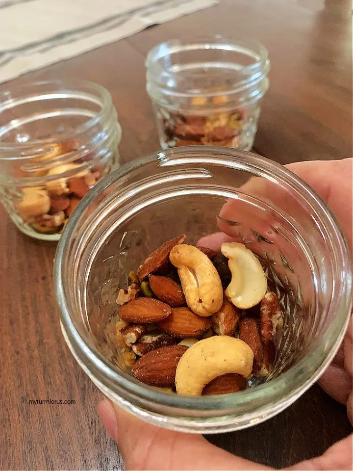 - Start your charcuterie cups by adding about 3 tablespoons of mixed nuts to the bottom of a 4 ounce mason jar. You could use only peanuts, walnuts or pecans if desired. These nuts will create a base to stabilize the filled skewers or food picks.