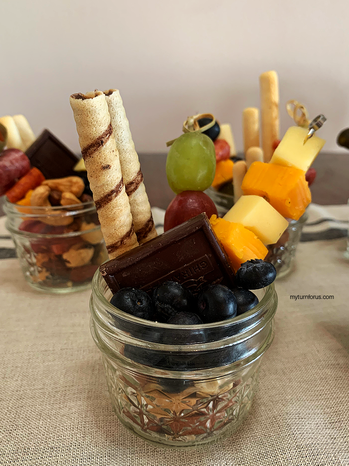 Create sweet or dessert individual charcuterie cups using cheeses, fruit, cookie sticks and dark chocolate squares. Place the cheese or fruit skewers/food picks in the mason jar. Then fill with additional fruit such as blueberries and top with a piece of dark chocolate.