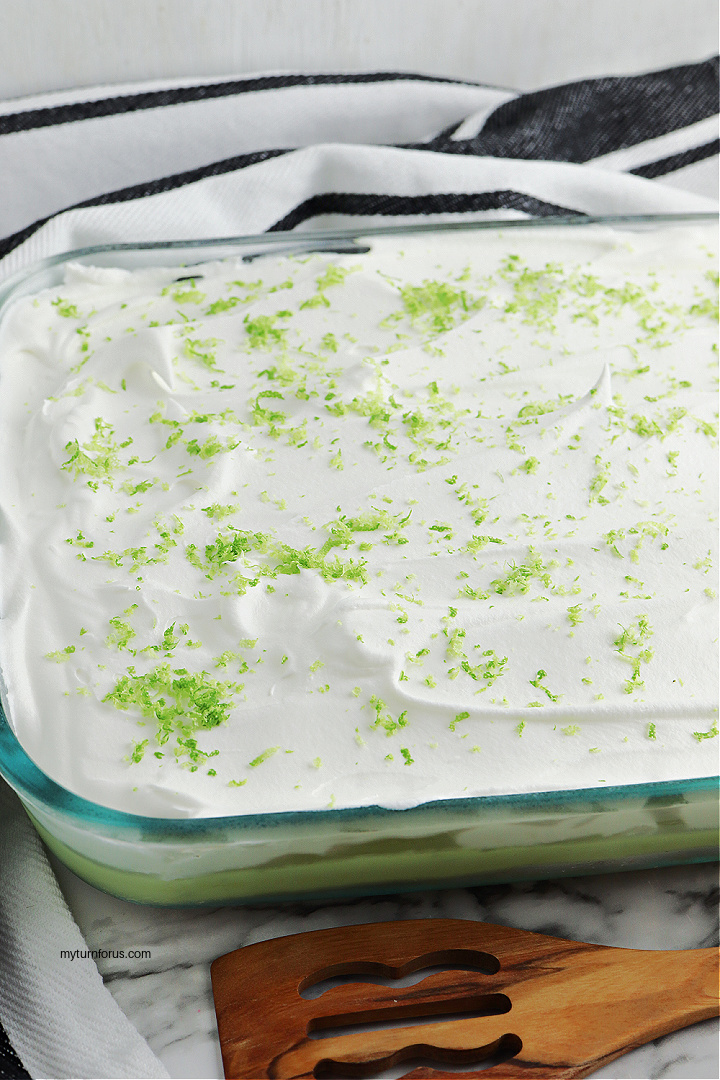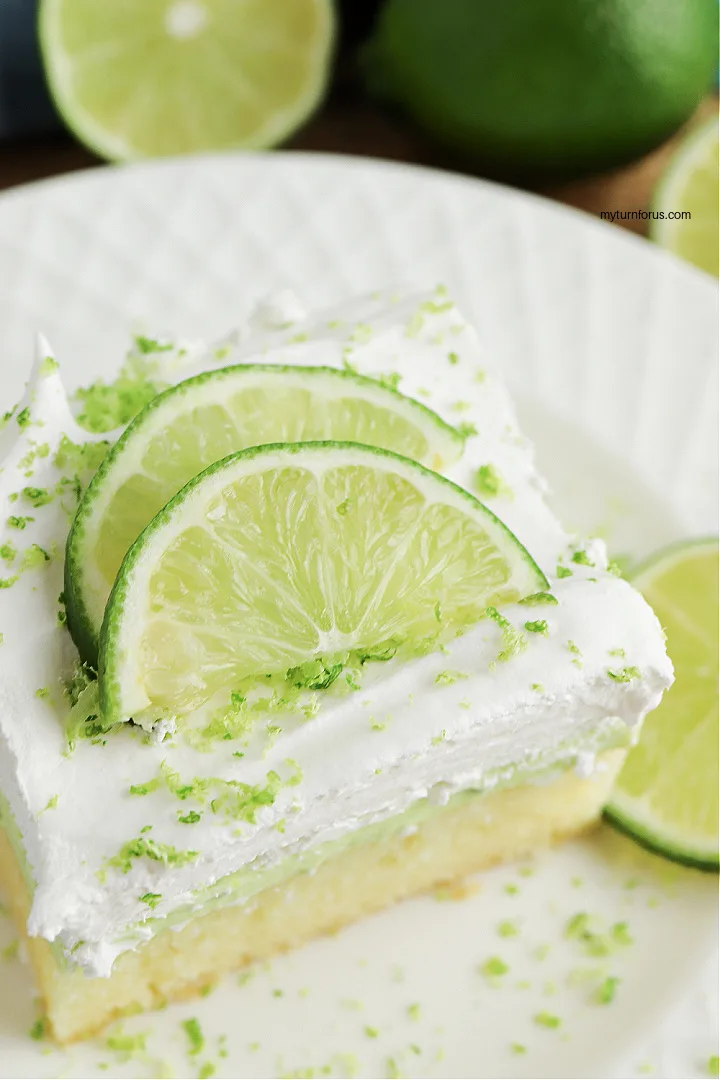 Top the whipped cream with lime zest and lime slices before serving. This recipe serves 15 and would be perfect for any spring gathering or anytime you need to serve a crowd.