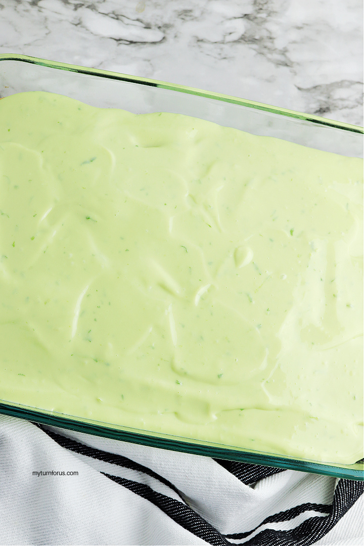 - Spread the key lime mixture over the top of the cake. Cover the pan and place the cake in the refrigerator to chill for one hour.