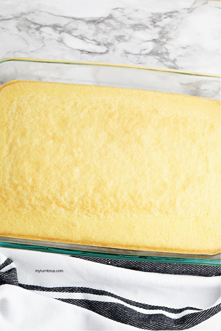 - Prepare the white cake according to the package instructions in a 9×13 baking dish (preferable clear) and allow it to cool completely