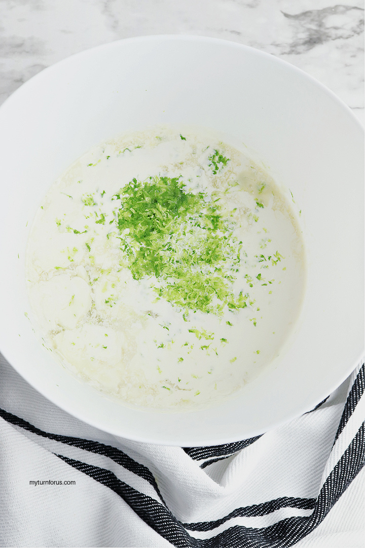 - In a medium bowl, whisk together the condensed milk, lime juice, whipping cream, lime zest, and green food coloring until just combined.