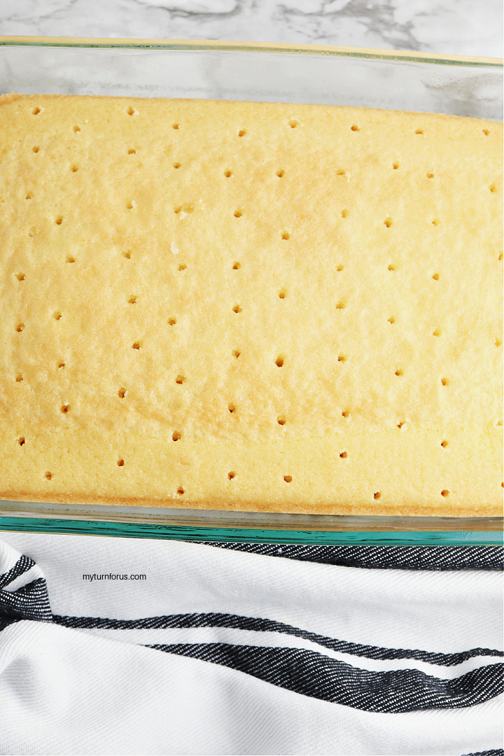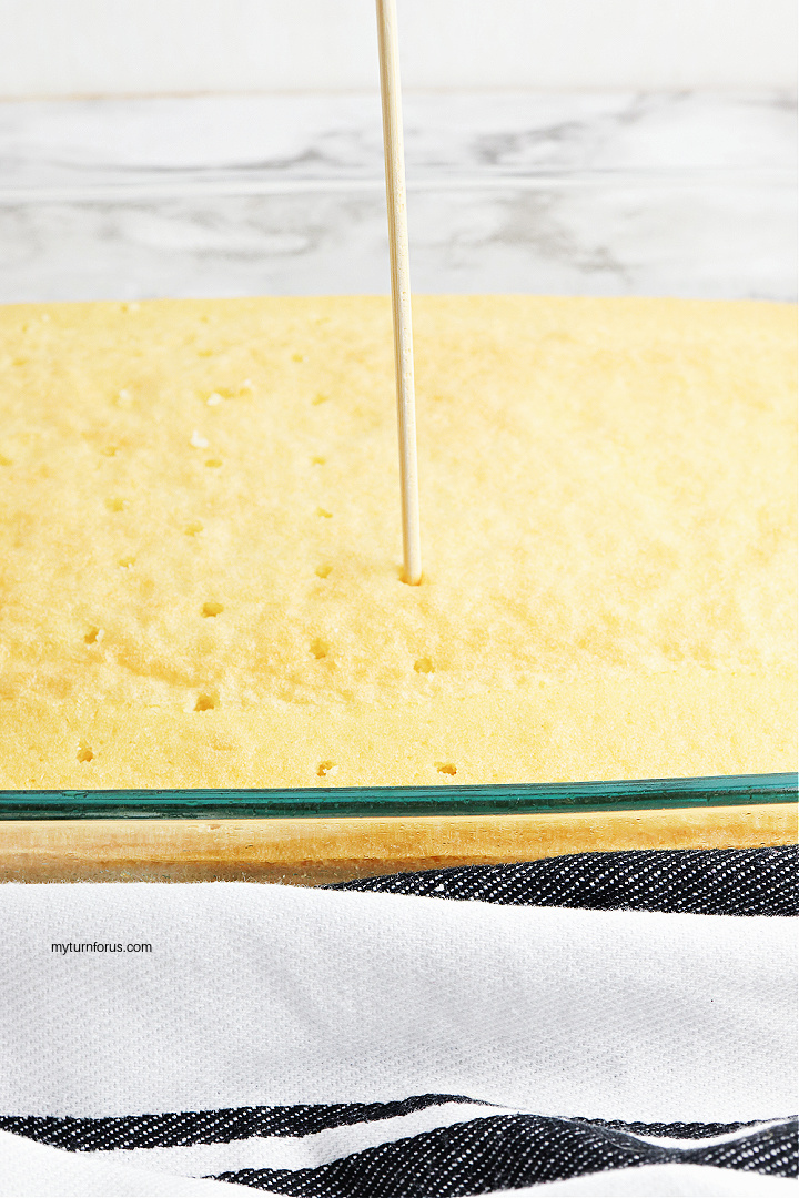 - When the cake is completely cooled, use a fork or wooden skewer to poke small holes all over the cake.