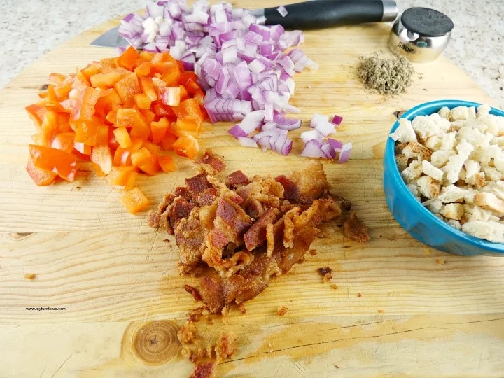 Fry 2 slices of bacon until crisp then remove and allow them to drain on a paper towel-lined plate. Chop the bacon, red bell pepper, and onion. Measure out other ingredients such as stuffing, sage, and low-fat grated cheese.