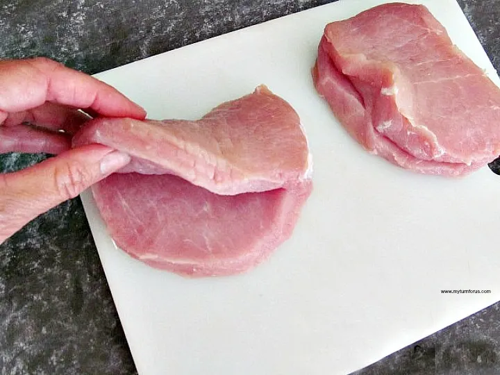 - Trim the fat on the pork chops and then carefully butterfly your pork chops. (simply pierce the longer side of the pork chop and slice all the way through leaving a flap of skin attached) Or get your butcher to do it.