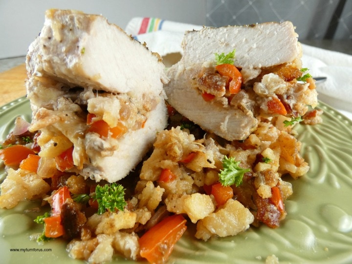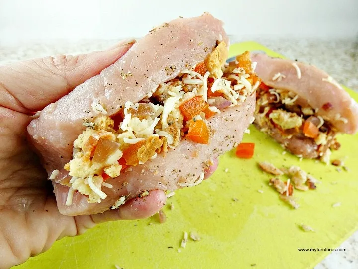 Our pork stuffing recipe replaces some of the heavier stuffing with veggies and adds some extra flavor. Also, we choose leaner pork chops and trimmed off the extra fat.