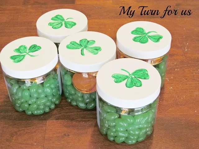• Stamp the top Lids with a Green Clover or paint a green clover on the lids of your jars
