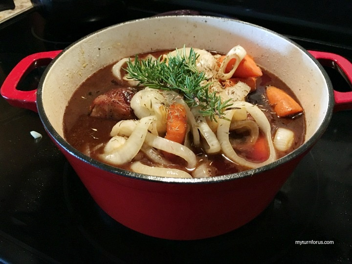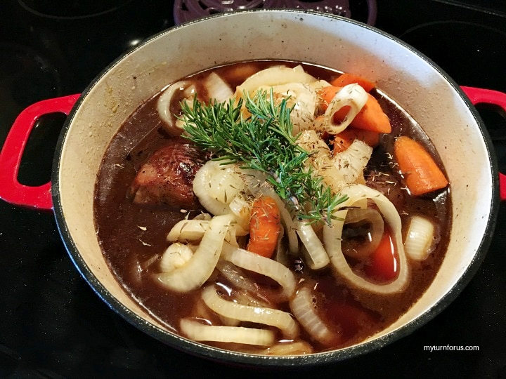 - Heat the olive oil in a dutch oven over medium high heat on the stovetop. Add the roast and sear on all sides, remove it to a plate and cover. Add the veggies to the dutch oven and stir to quickly sear them and remove to a plate. Return the roast to the dutch oven and add the veggies.