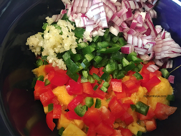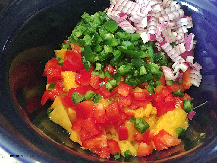 • Start by adding the chopped mangos, bell pepper, jalapeños and red onions to a mixing bowl.