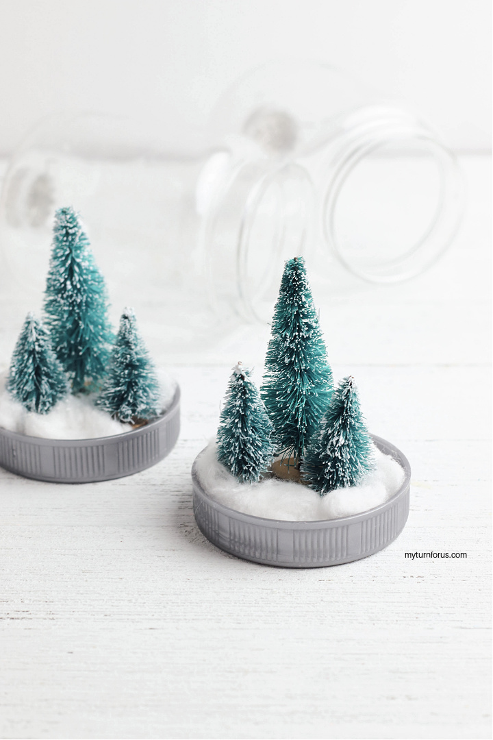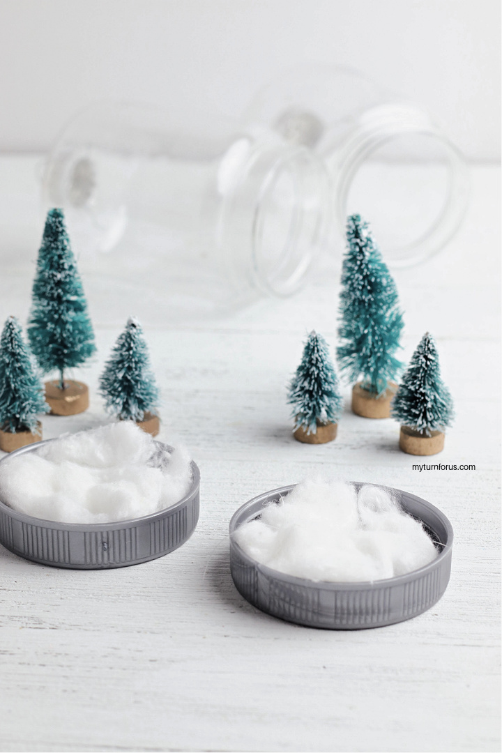 Remove the lid from the snow glob ornaments and glue several cotton balls to the inside bottom of the lid.