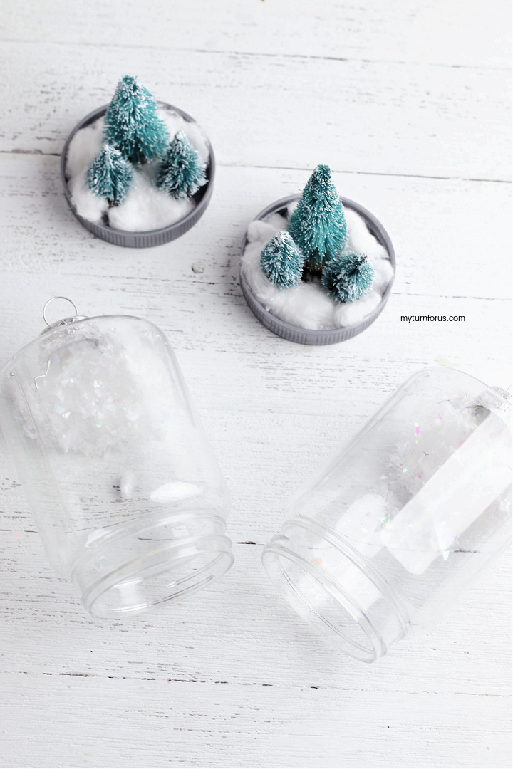 DIY Mini snow globe Christmas ornaments from empty Dollar Tree snow globes. This easy craft makes waterless snow globes to decorate your Christmas tree or around your home.