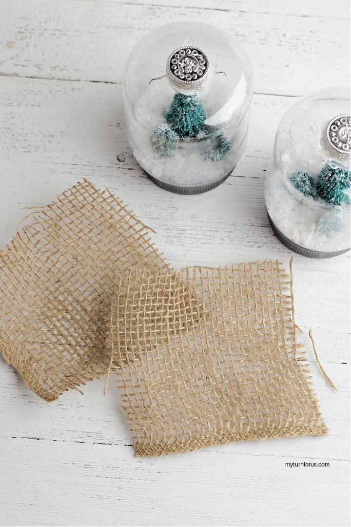 Cut two 3-4 inch square pieces of the burlap to cover your snow globe lids.