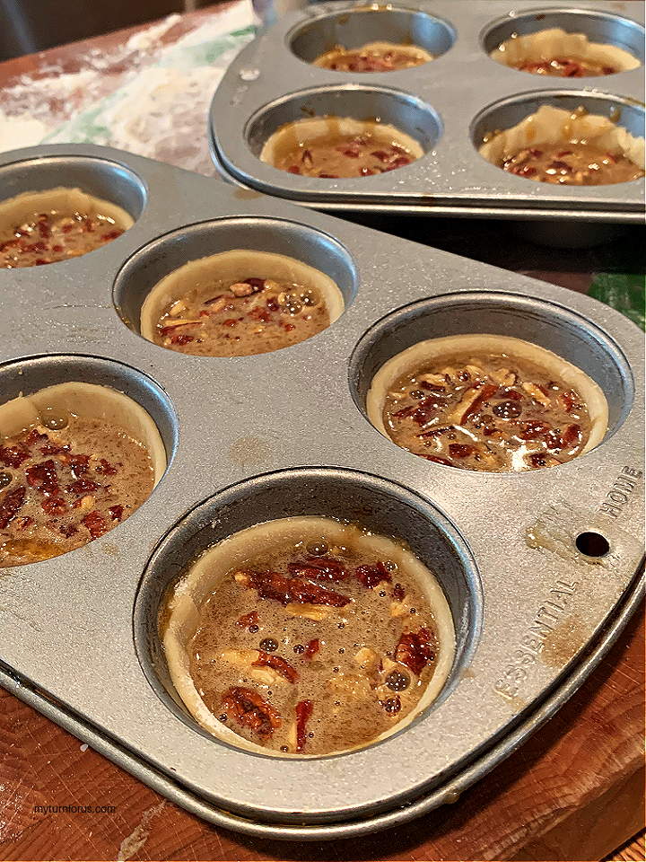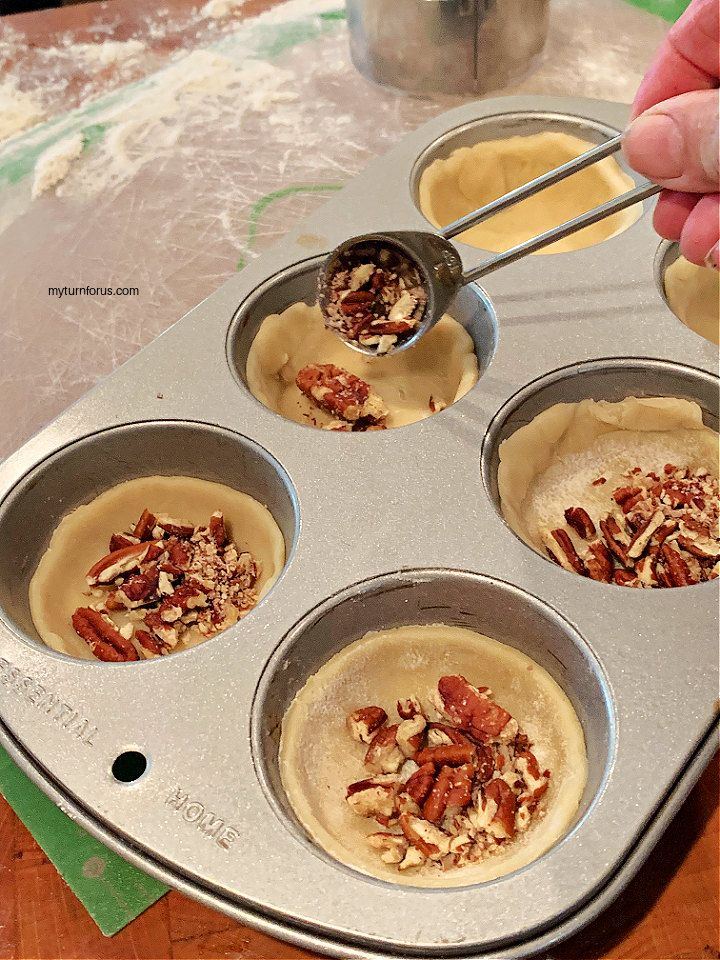 - Place two tablespoons chopped pecans in each pecan pie cup.