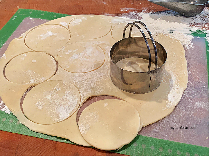 - Preheat oven to 350°F . Roll pie dough on a lightly floured surface. Use a 3-inch round biscuit cutter, cut out rounds rerolling and cutting until all the dough is gone. You should have 14-16 rounds of mini pie crusts.