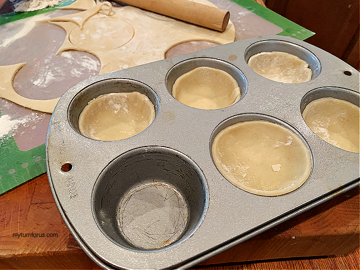 - Continue until all the pie dough is gone. Each crust should should come up on the sides a little more than halfway. You should have 14-16 mini pie crusts.