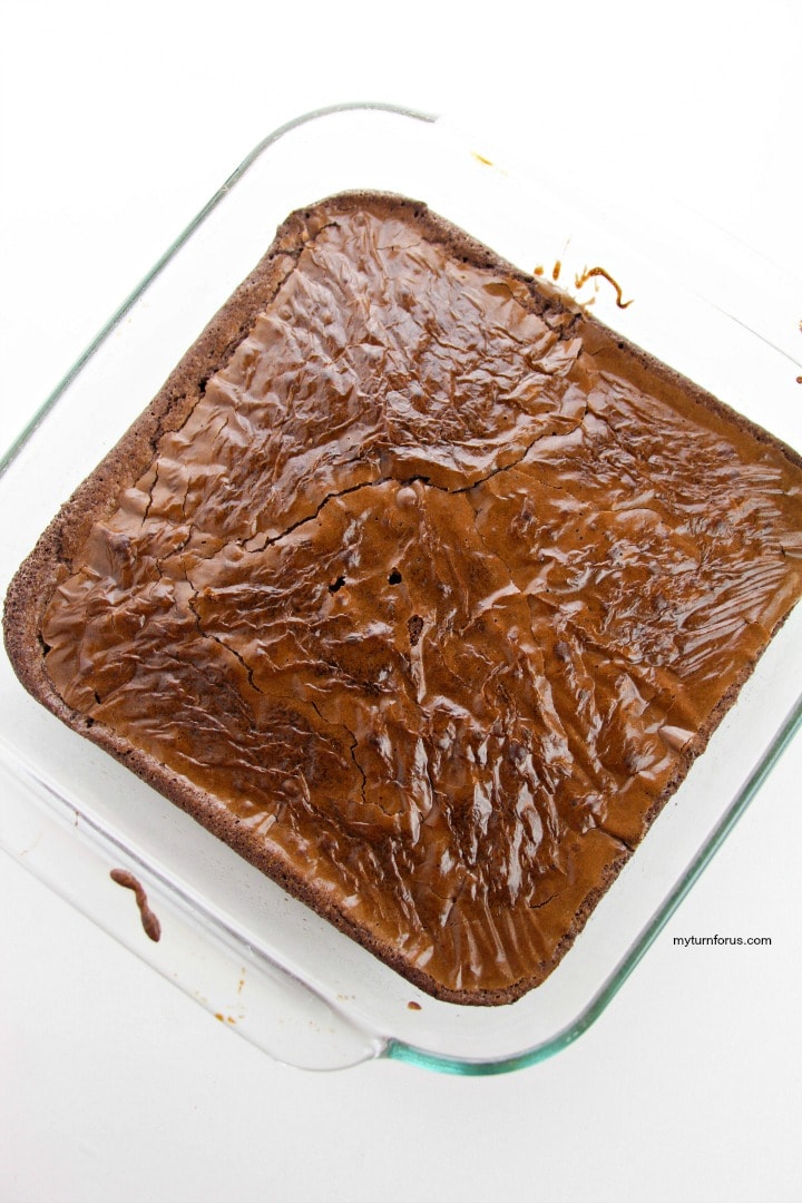 - Pour the brownie batter into your prepared 9 X 9 baking dish. And place in preheated oven and bake for 30-35 minutes, until an inserted toothpick comes out clean with just a few crumbs attached.