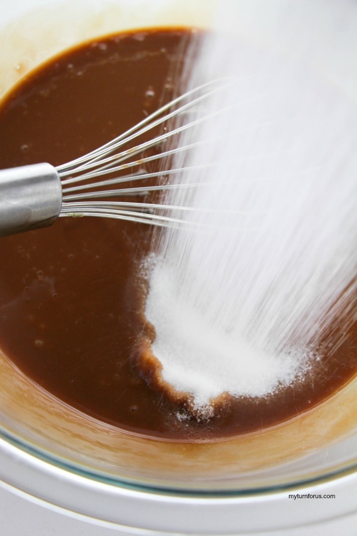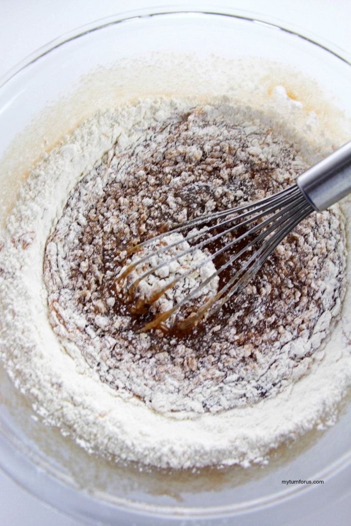 - Whisk in the sugar and again whip well. Add the flour and mix until thoroughly combined and there are no dry ingredients showing.