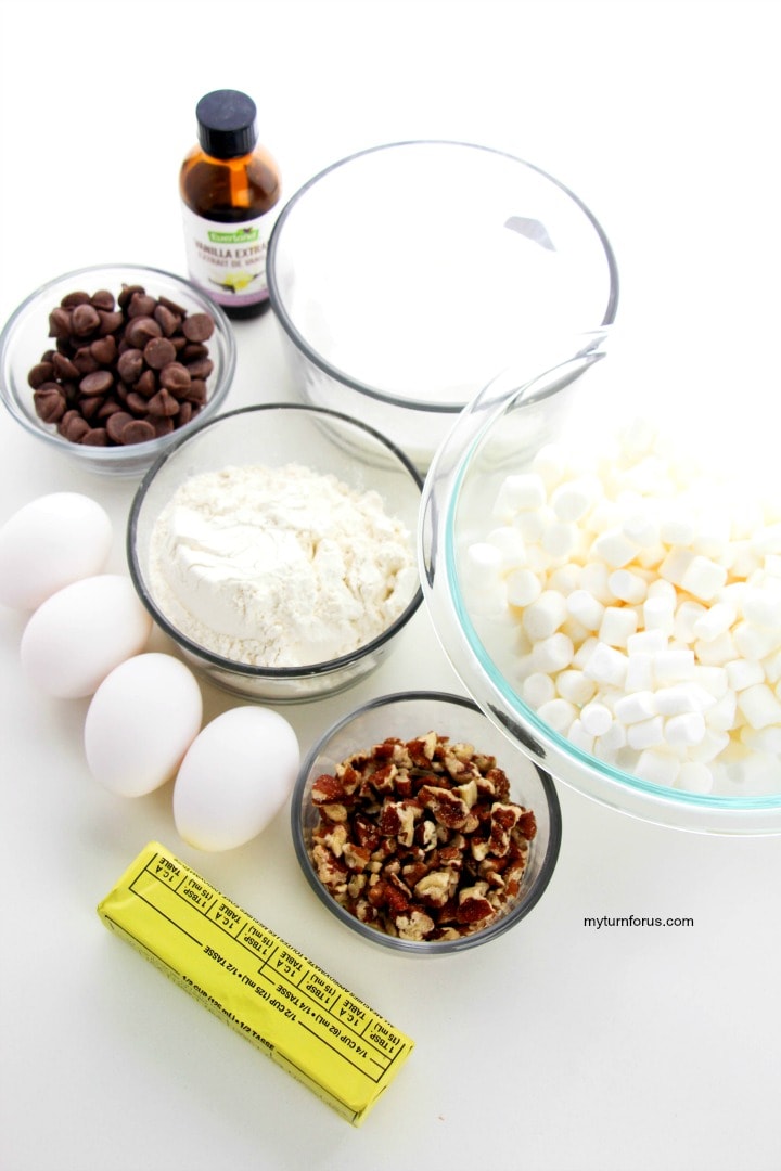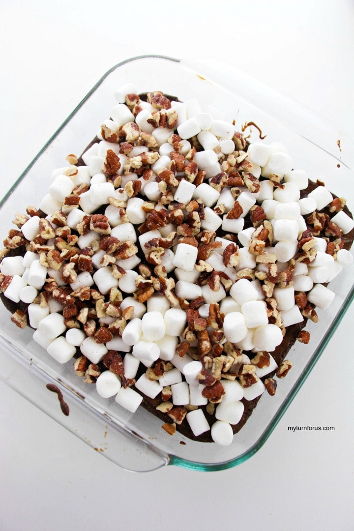 - Place the pecans on a baking dish and toast in the oven for 5 minutes until fragrant. Scatter the mini marshmallows and toasted pecans on top of the brownies.