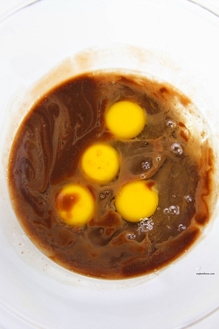 - Whisk the butter and chocolate mixture until completely smooth. Then break your eggs in a separate bowl and add to the mixture. Whip well.