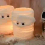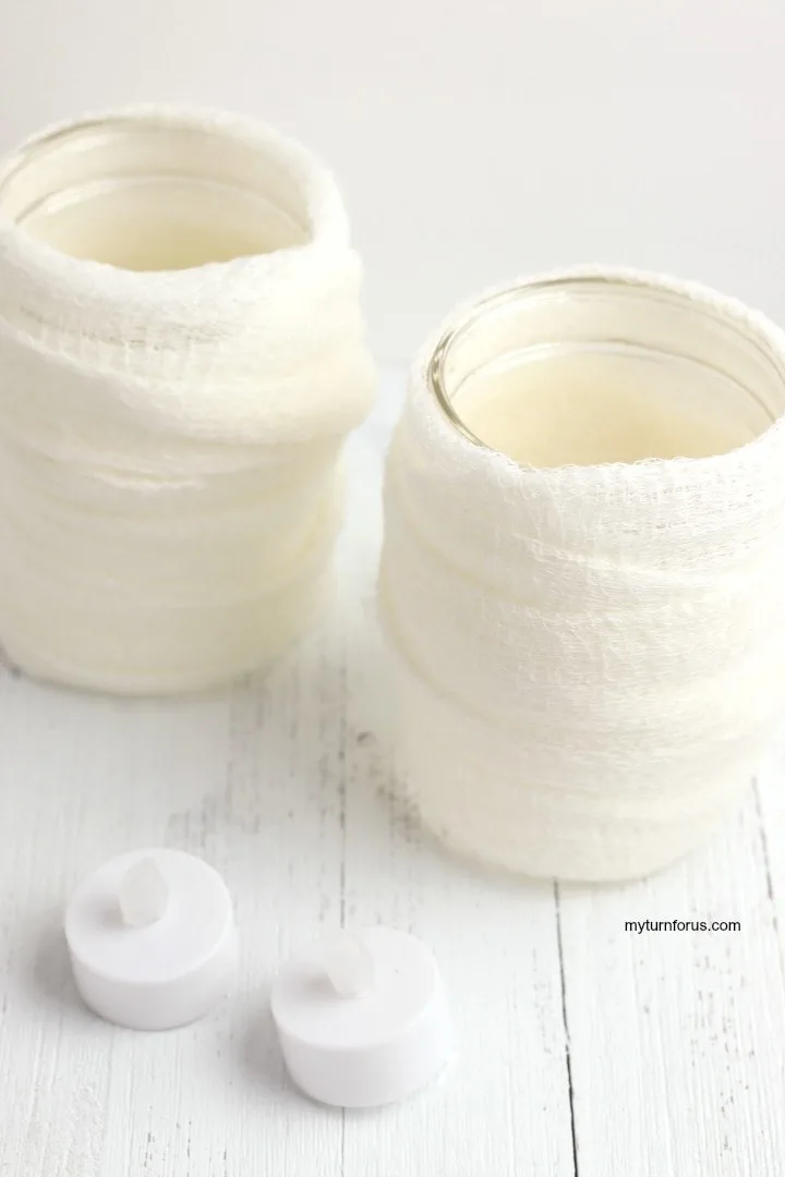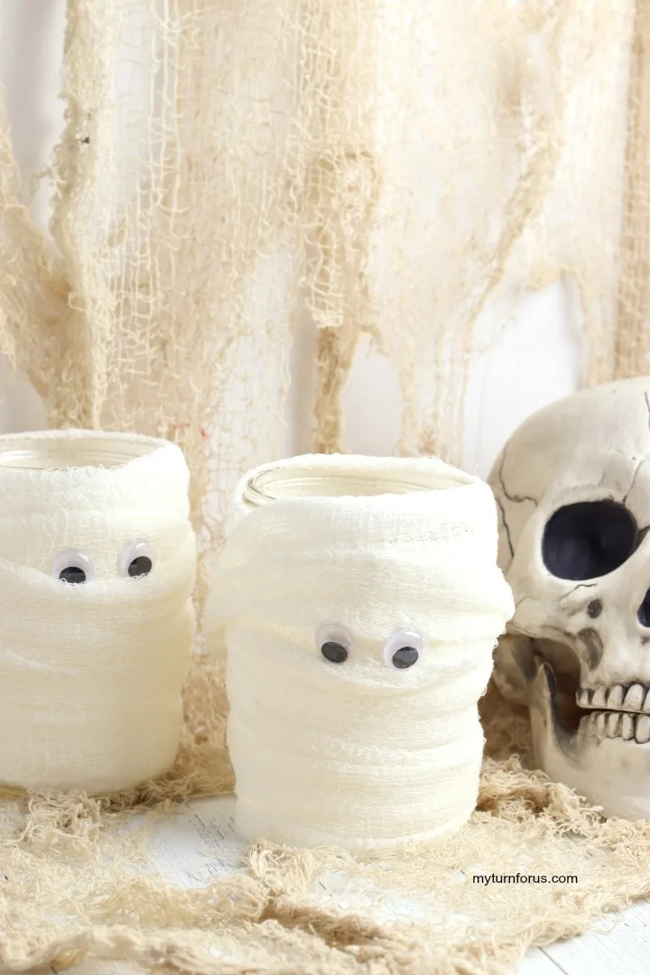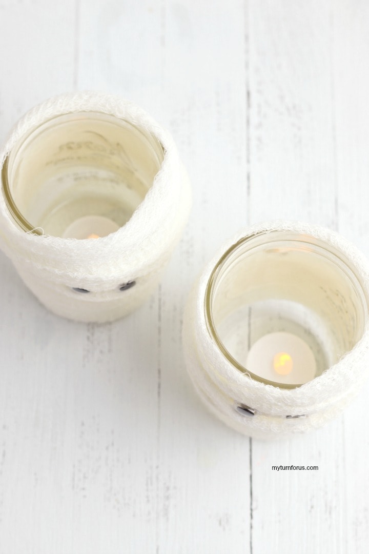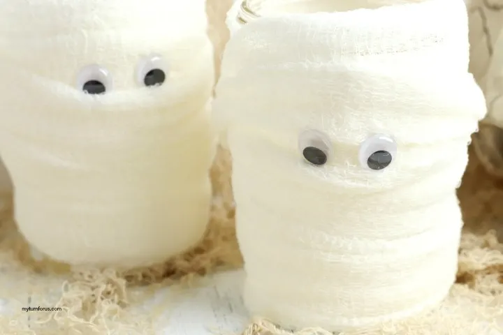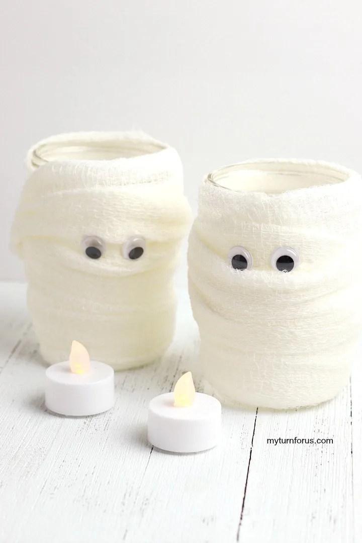 Looking for a unique and budget-friendly way to decorate for Halloween? These mummy candles are the perfect choice! They not only make great centerpieces or decorations for a Halloween party, but they also double as luminaries for a spooky effect. These mummy candle holders are easy Halloween mummy craft for kids.