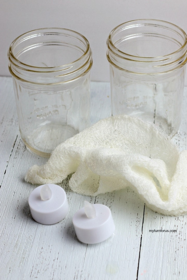 Glue one end of the gauze to the bottom of your mason jar. Wrap the gauze around the jar until it’s fully covered. Glue the end to secure.
