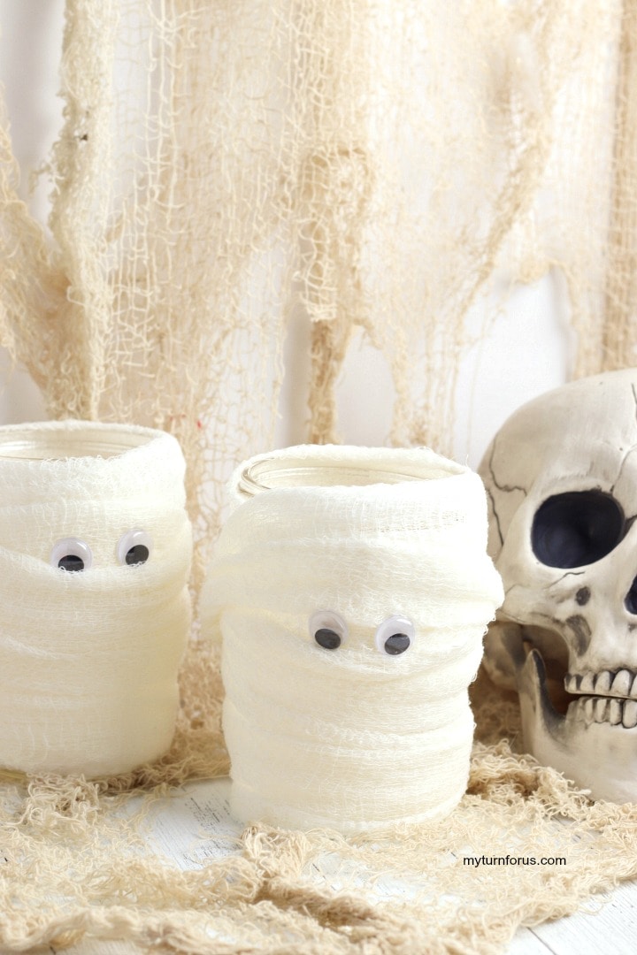 And this Halloween mummy craft is super easy and inexpensive. They are not scary nor creepy but kinda adorable but they still add to the atmosphere of Halloween. Just wrap the gauze around the jar and add googly eyes for a cute and whimsical touch. And they when the sun goes down they make awesome Halloween luminaries. They also are great Halloween lighting ideas for parties or a Halloween tablescapes.