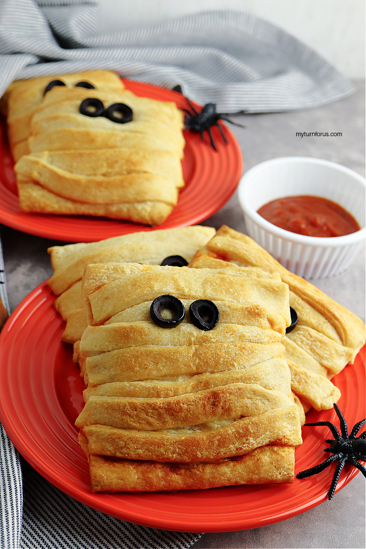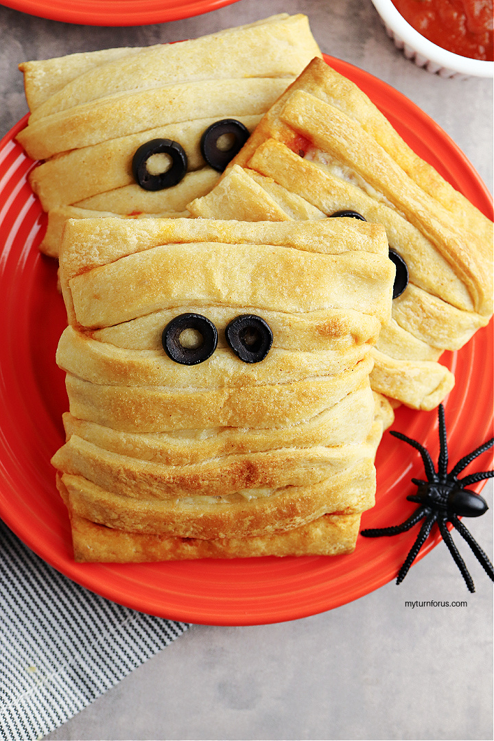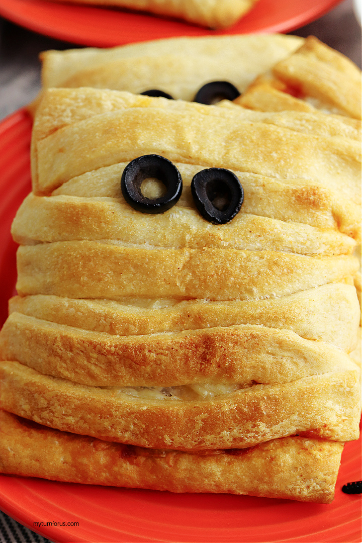 - Serve these yummy mummy pizzas for a fun treat for lunch or at any of your Halloween parties.