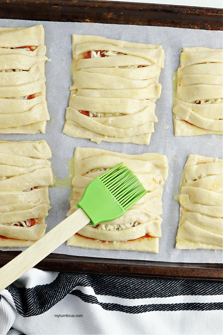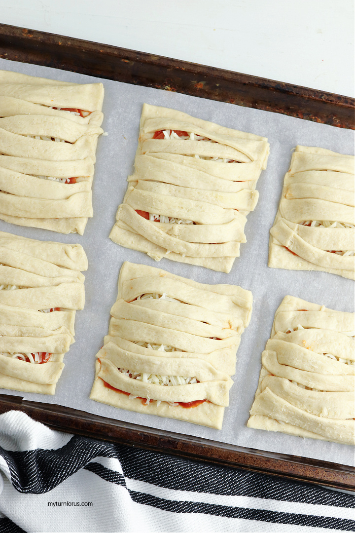 - Arrange the dough strips on top of each of the mini pizza pocket toppings. Press the ends of the strips into the sides of the rectangle dough to seal them into place.