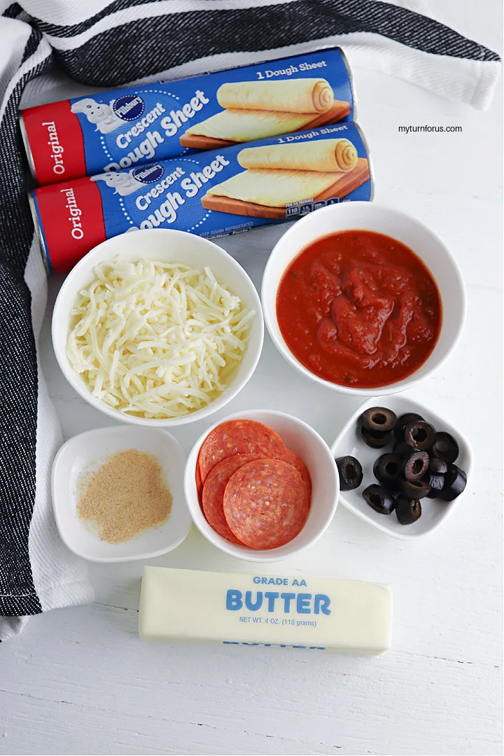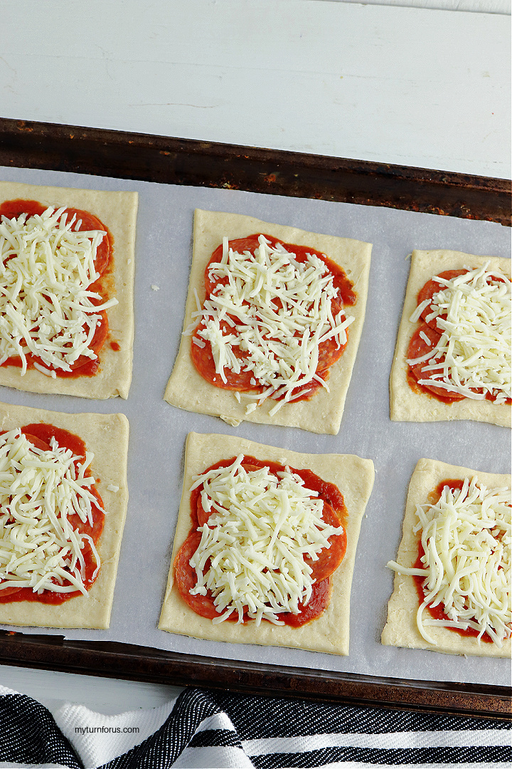 - Start these mini pizza pockets by preheating your oven to 375° F and lining a baking sheet with parchment paper. Unroll one of the crescent roll dough sheets and cut into 8 rectangles using a pizza cutter. Place the rectangles on the prepared baking sheet.