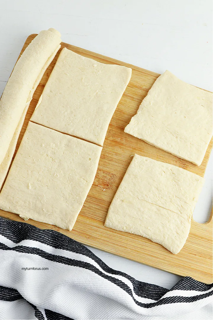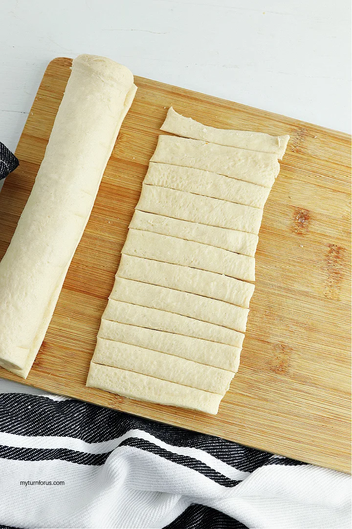 - Unroll the second crescent roll dough sheet and cut it into 8 rectangles using a pizza cutter, roughly the same size as the first set. Then cut each rectangle horizontally into strips and set the strips aside.