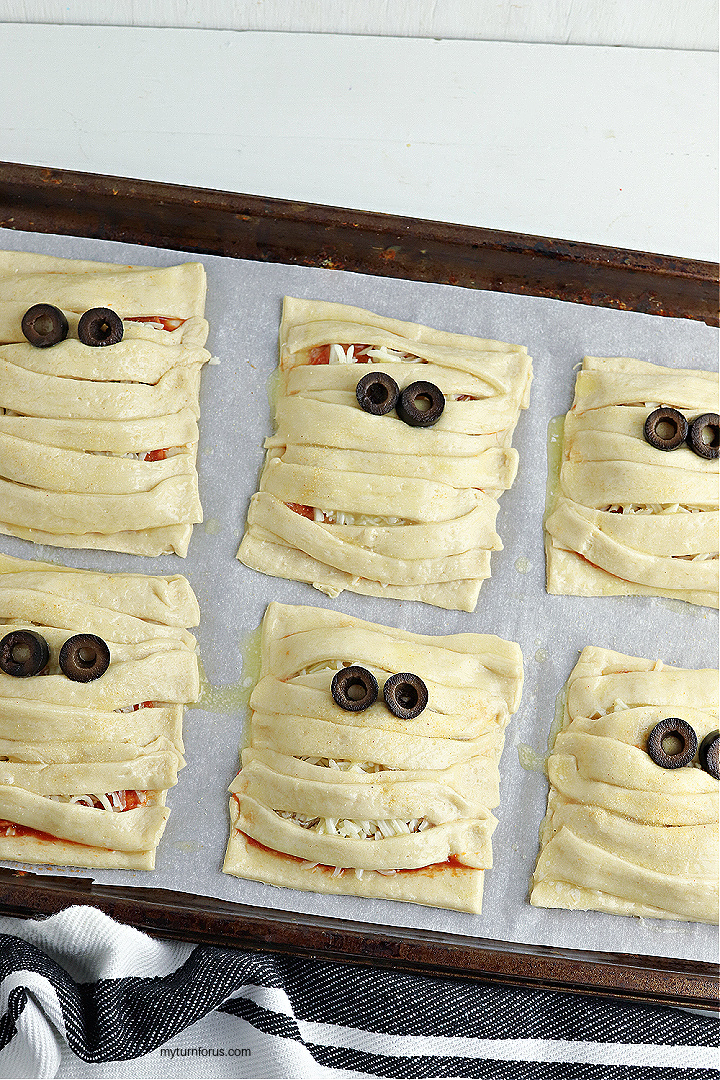 - Place two slices of the black olives for eyes on top of each your mummy pizza pockets. Place in the preheated oven and bake for 12 to 15 minutes, until golden brown.