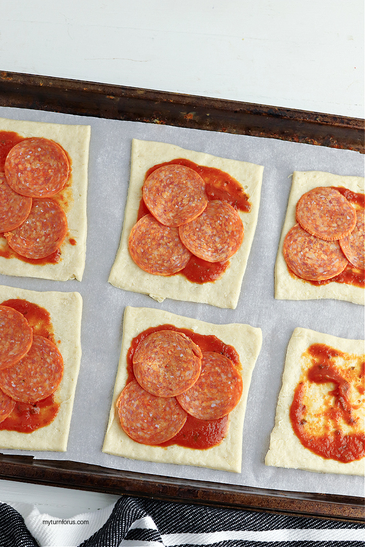- Spread a small spoon full of pizza sauce over the top of each dough rectangle, making sure to leave the edges clean.